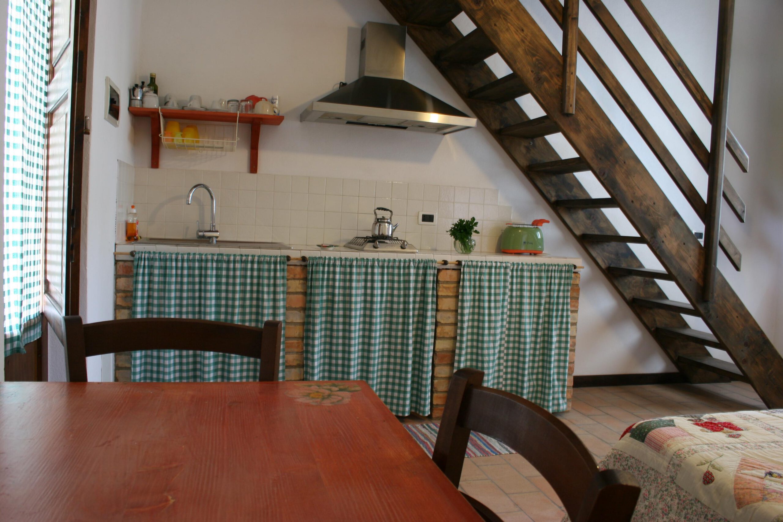 In the old stable are 3 small apartments: The Red, The Green (this one) and The Yellow. On the ground floor, each apartment has a bathroom with shower, a kitchenette and 1 or 2 single beds. Upstairs a double bed. Outside a shaded veranda of 60 m² with table and chairs.